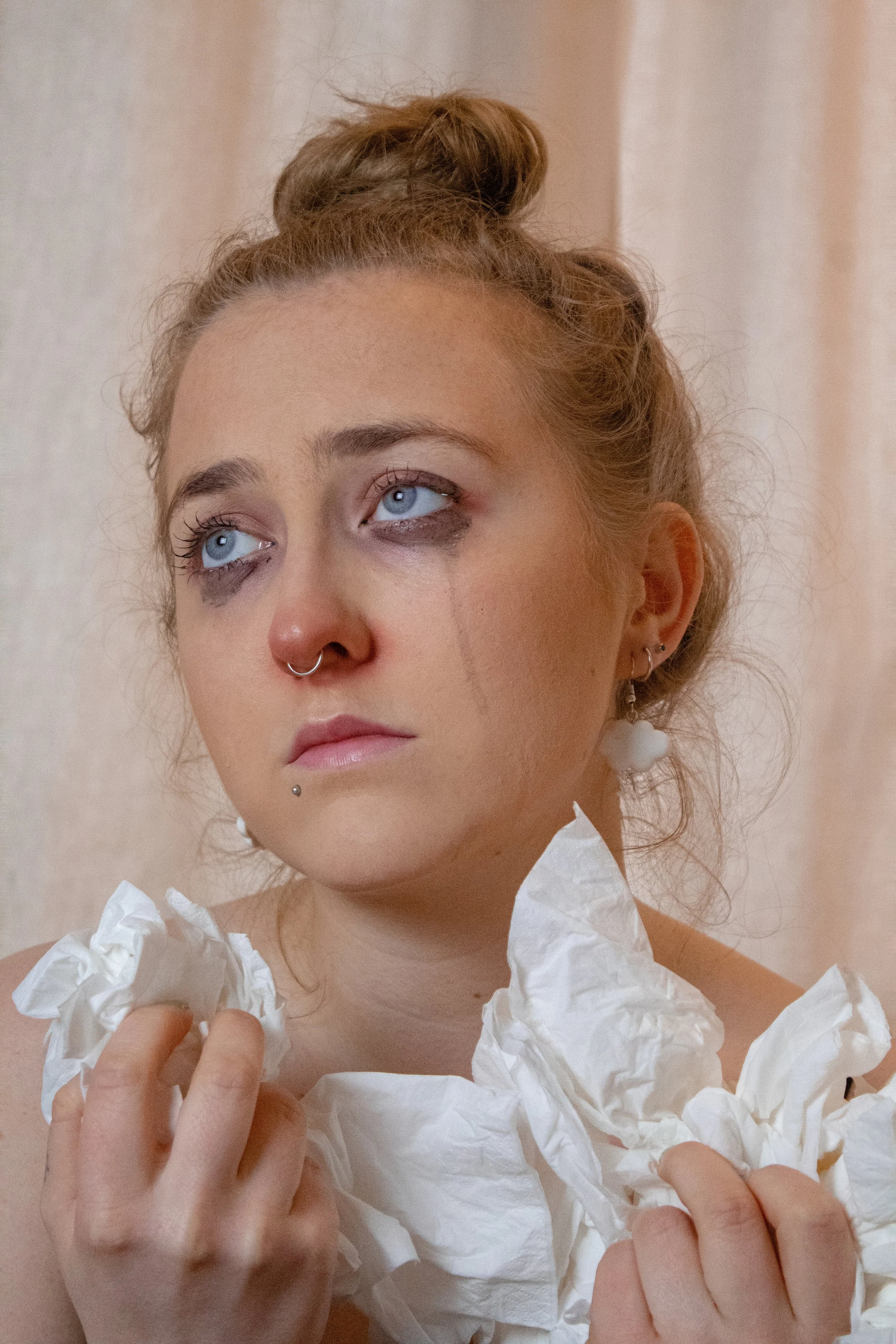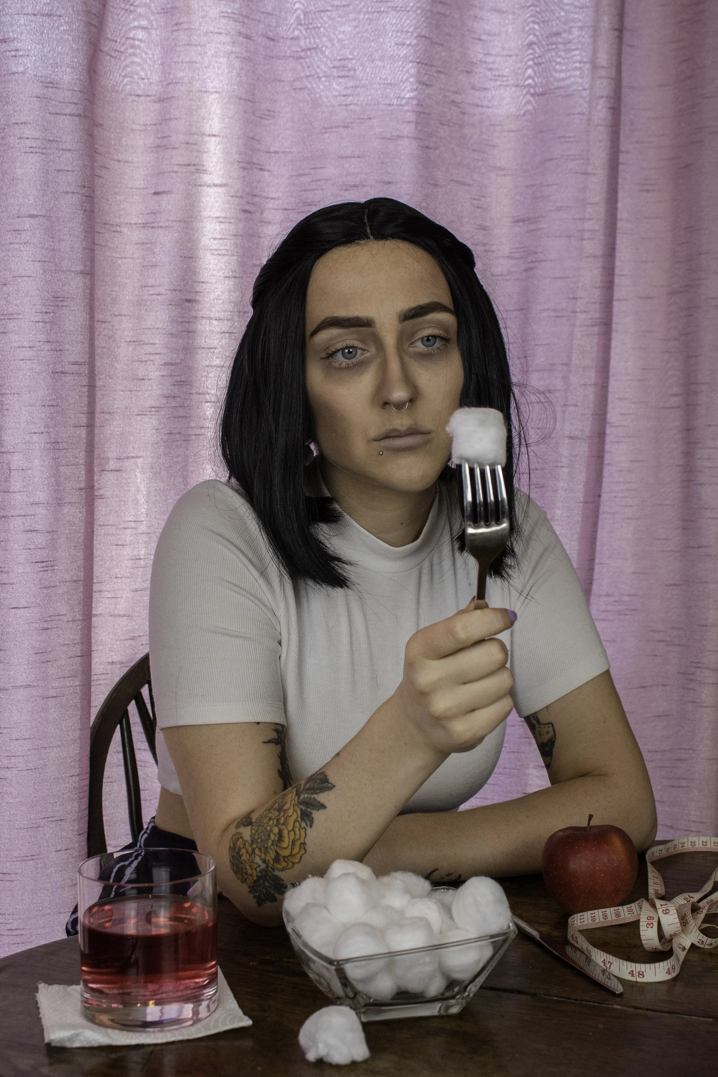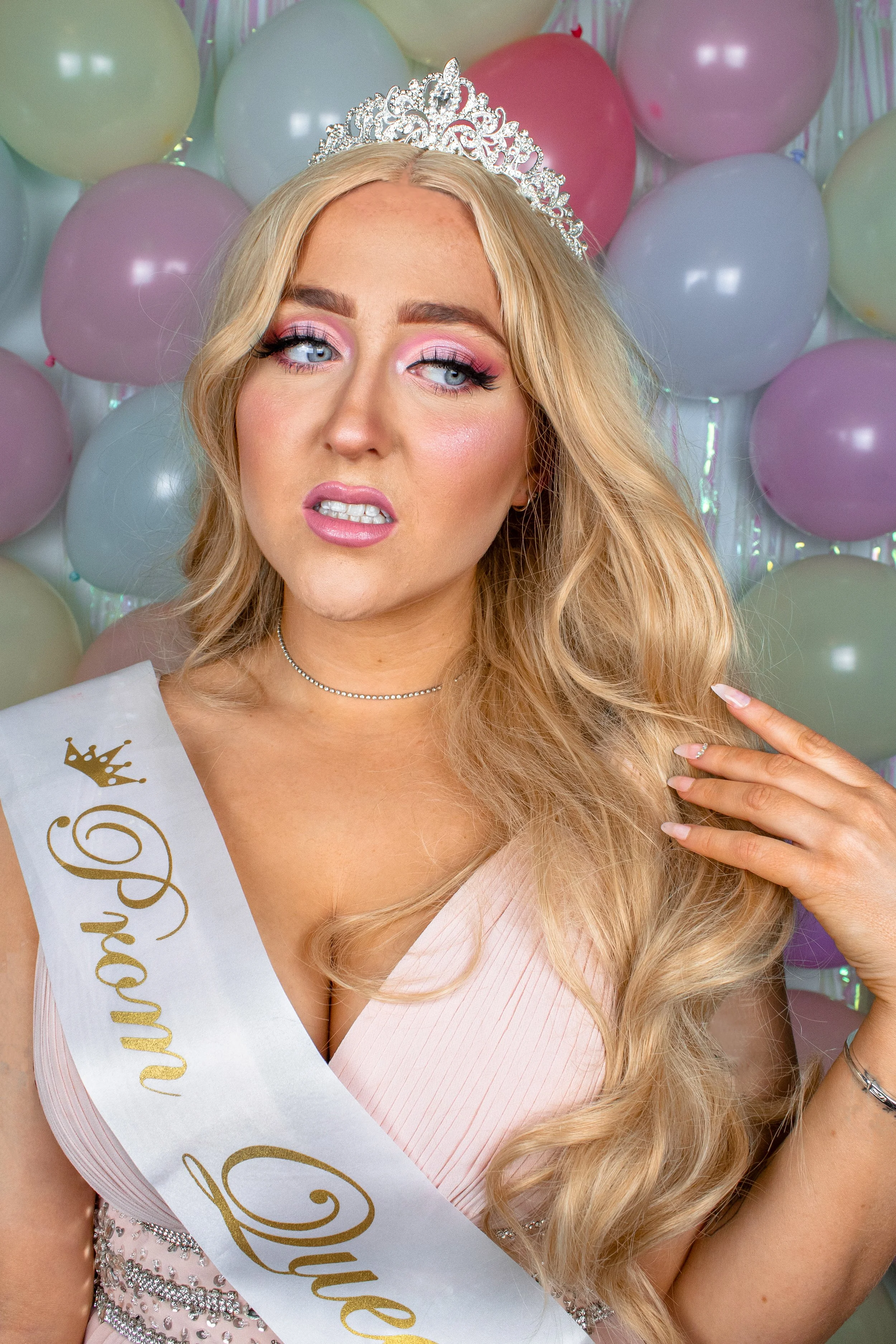 I set up my studio lights outside of my garden shed, adopted a bleach blonde wig and pulled a few confused facial expressions to play on the ‘dumb blonde’ (otherwise known as a bimbo) stereotype.